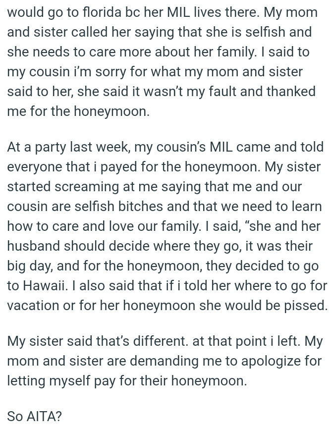 I believe I might be the asshole because my mom and sister didn’t want me to pay for my cousin’s honeymoon, but I paid for it anyway.We've gathered some of the most upvoted comments from other Redditors for you to read through below