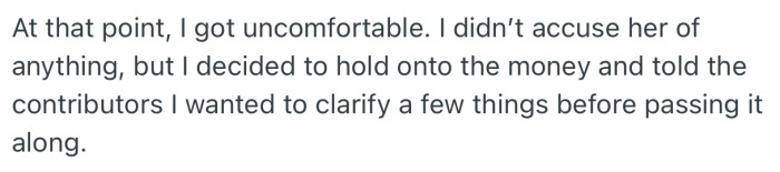 Once the details “didn’t quite line up,” the OP’s position shifted from helper to gatekeeper, and that made the fundraiser feel sticky for both sides.