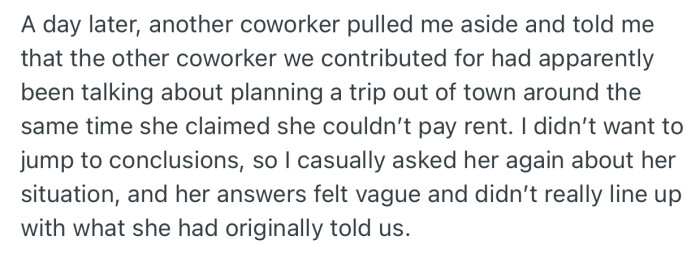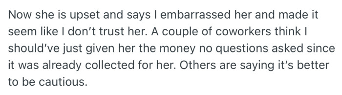 But then the questions start. After the coworker opened up, people felt uncomfortable with how much was known, how the situation was being explained, and whether the money was being handled with enough clarity. On one side, the coworker likely felt exposed, like her personal situation was being treated like a public performance. On the other, the OP got stuck holding everyone’s trust, and once things “didn’t line up,” handing over the money without answers felt risky.