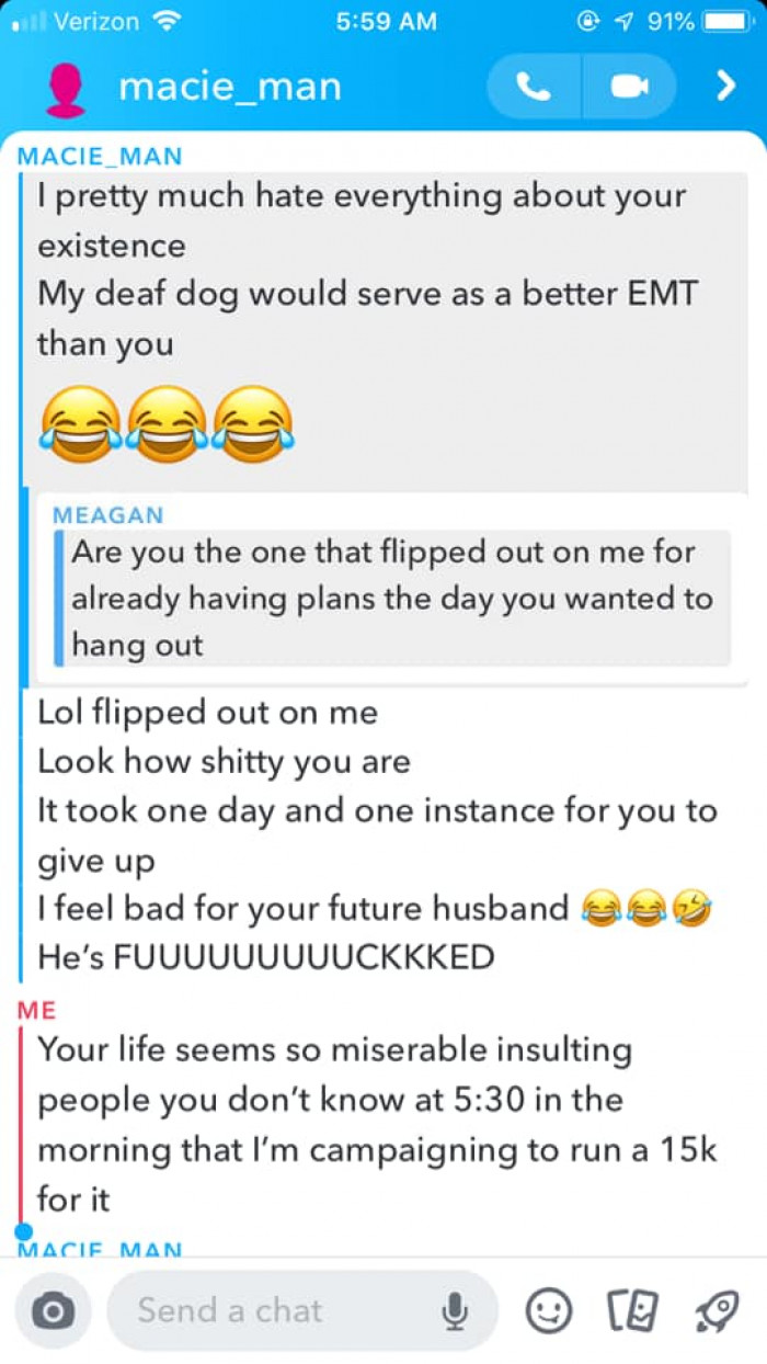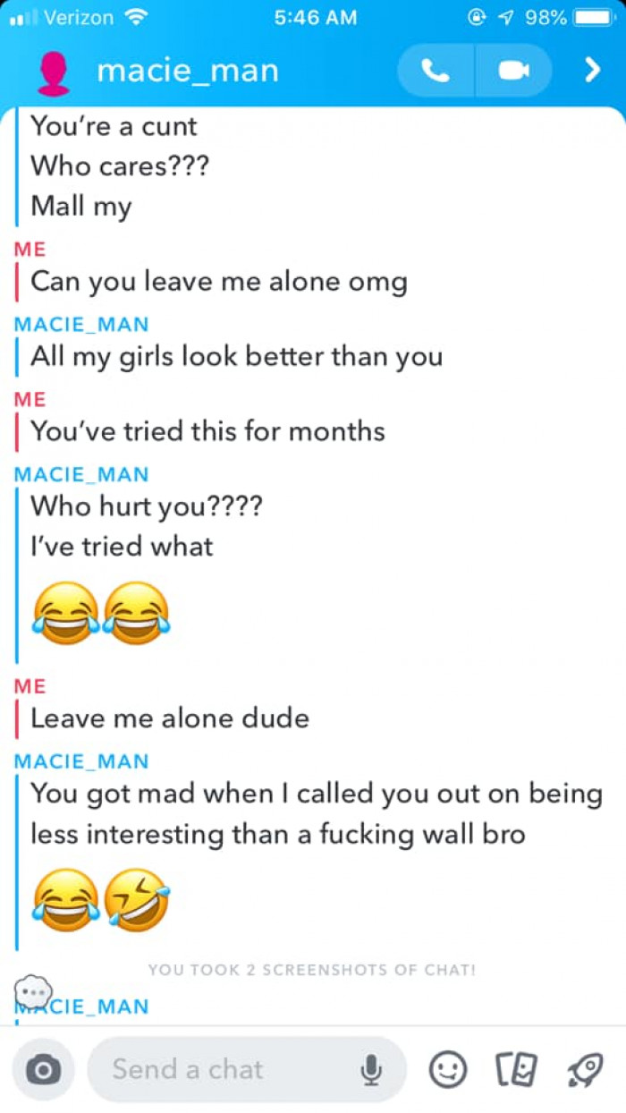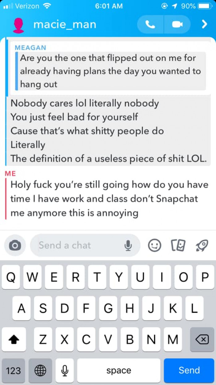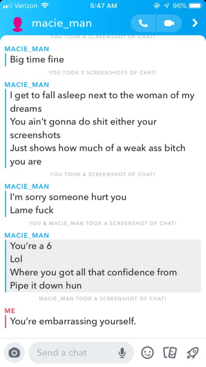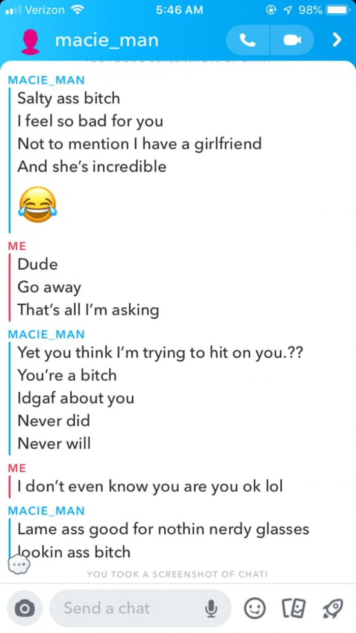 A woman named Meagan Kennard went public about a guy who spent about 24 hours sending her harassing DMs on Snapchat. They had matched on Bumble at some point but didn’t meet.