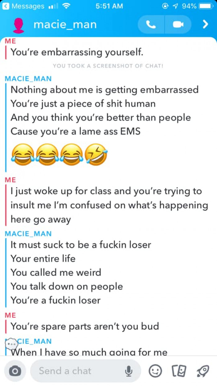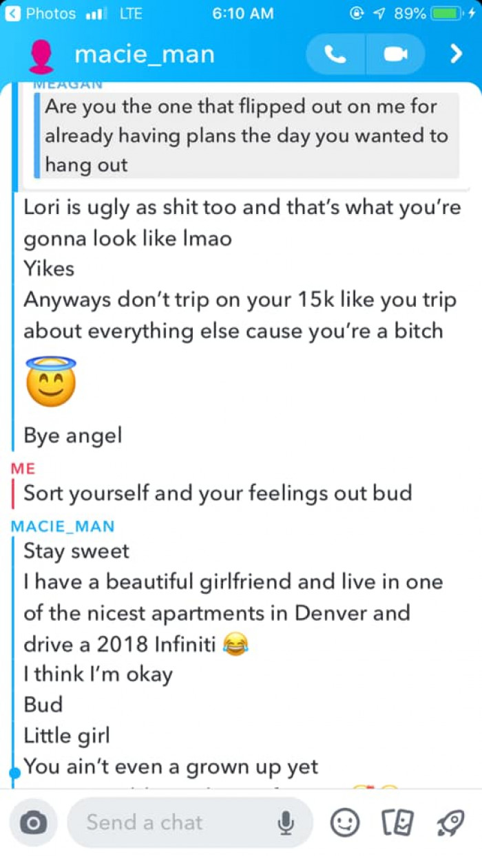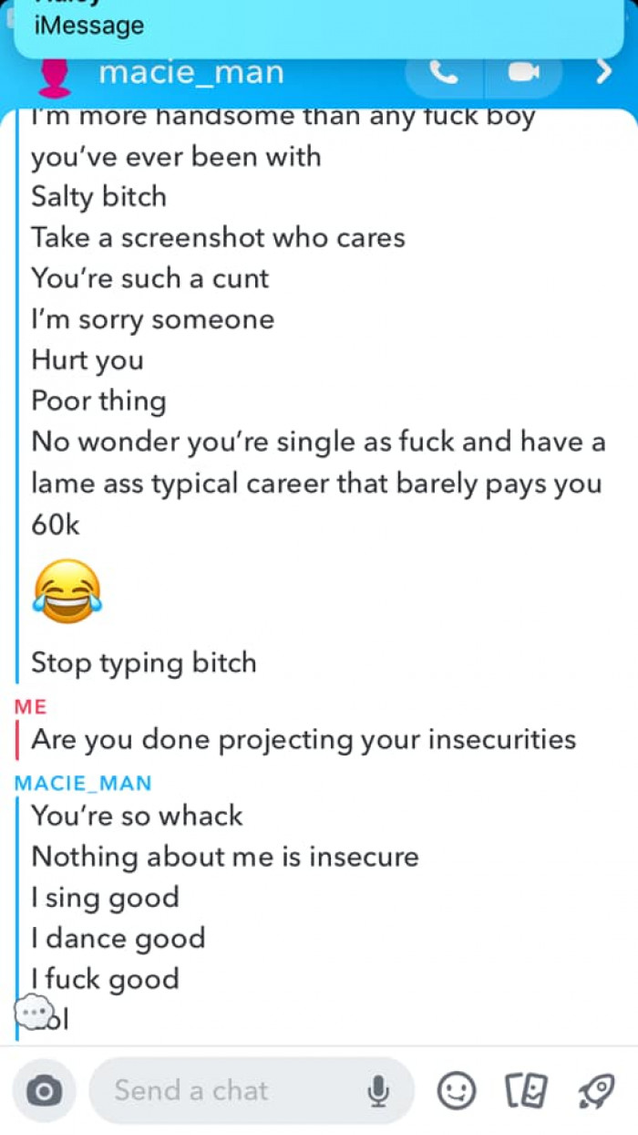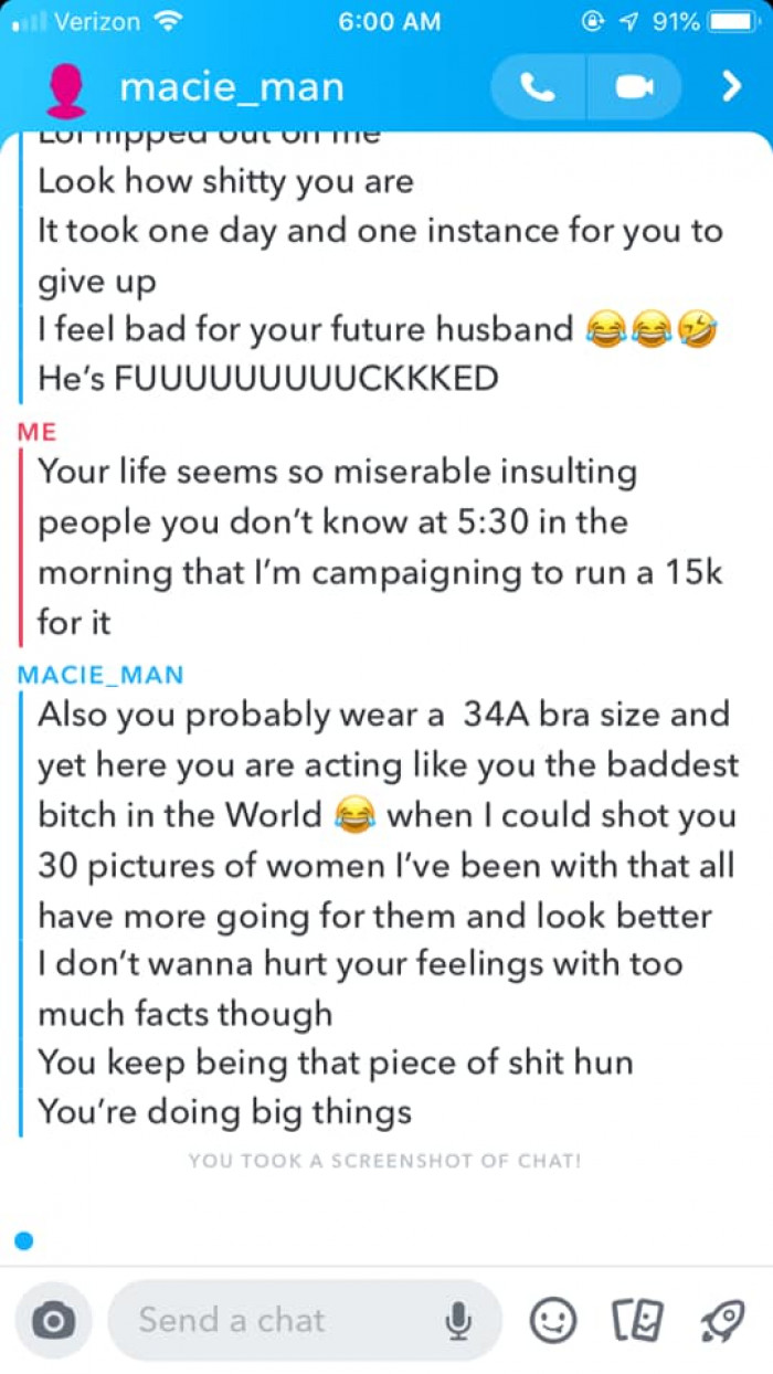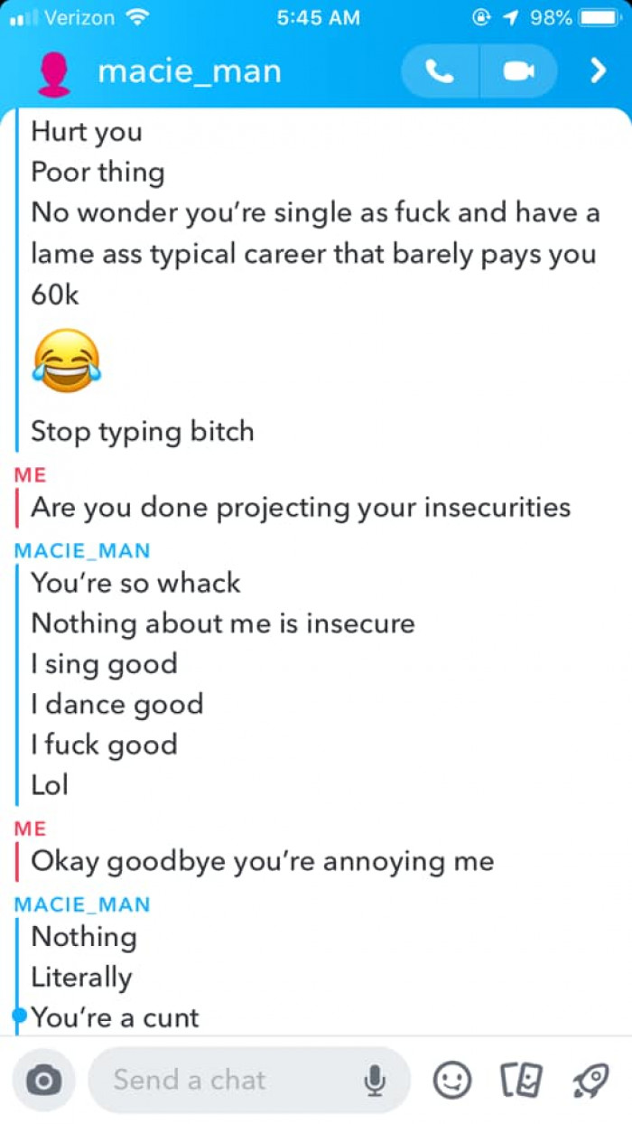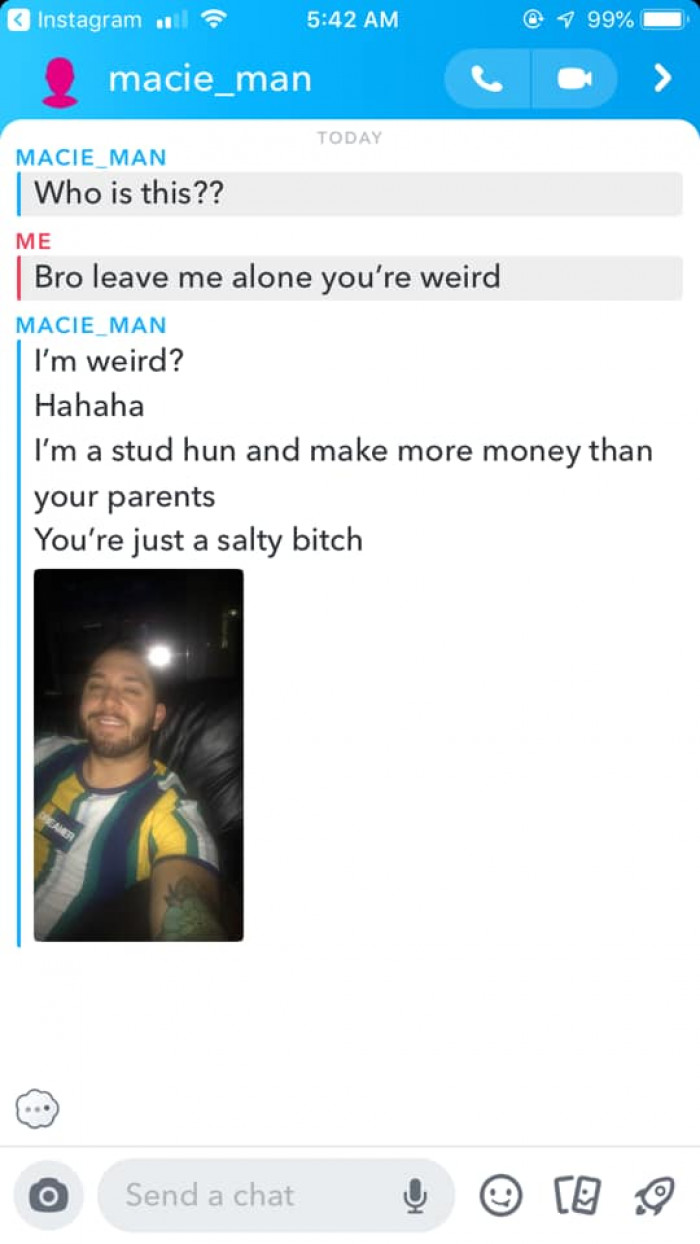 A woman named Meagan Kennard went public about a guy who spent about 24 hours sending her harassing DMs on Snapchat. They had matched on Bumble at some point but didn’t meet.
