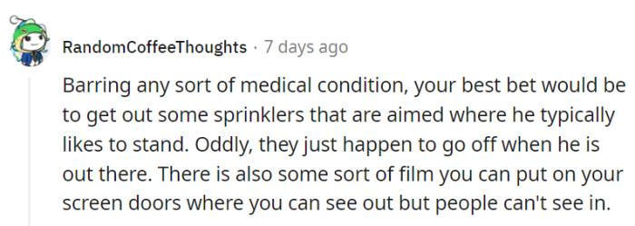 Motion sensor sprinklers for the dog and a doorbell camera for the neighbor—the perfect combo to keep the creeper behavior at bay!