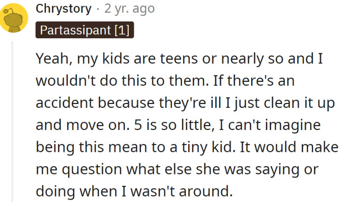 However, an incident caused the OP to question this decision. On a particular day, arriving home unexpectedly early, the OP was met with the distressing scene of their son in tears, attempting to clean his own vomit from the bed.