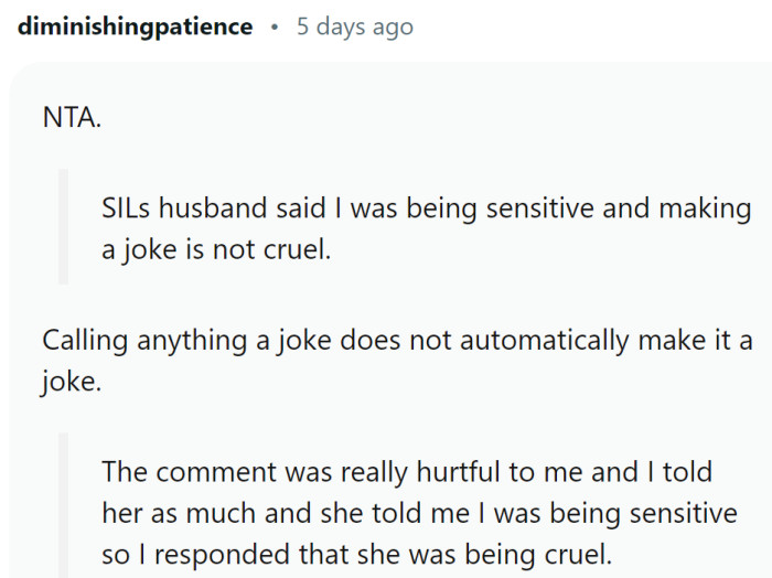 However, her SIL's husband claimed OP was being sensitive and that the joke was not cruel. The SIL accused OP of looking for a reason to call her out and blamed OP for taking her issues out on her.
