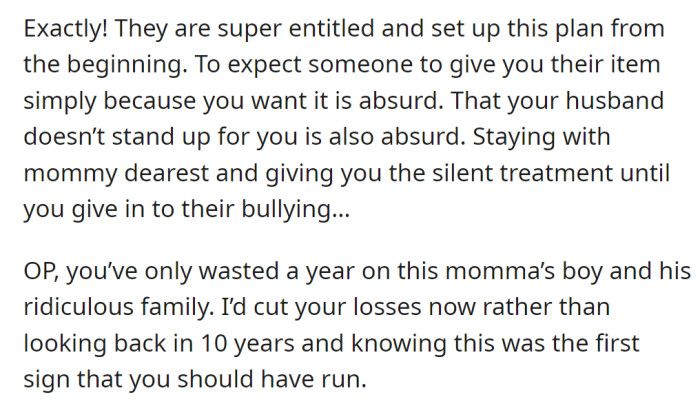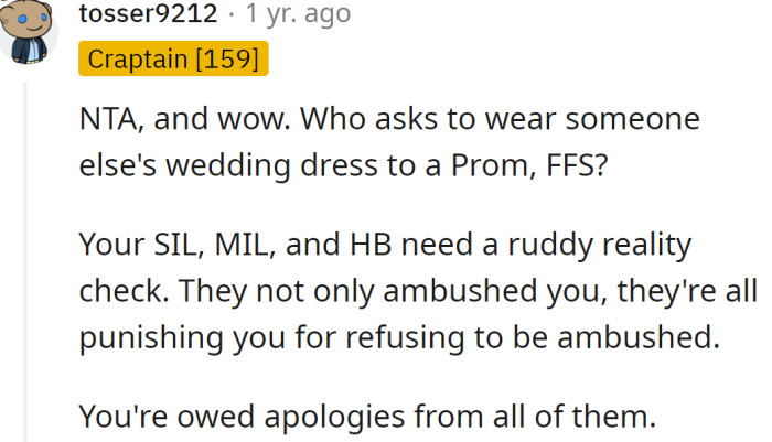 Later, upon seeing the sister in a new blue dress, the OP complimented her, but then her MIL expressed a strange demand. The MIL told her to either sell the dress and get her half back or directly help with half the payment.