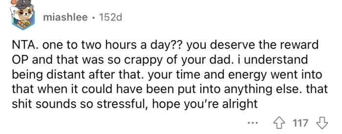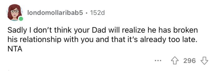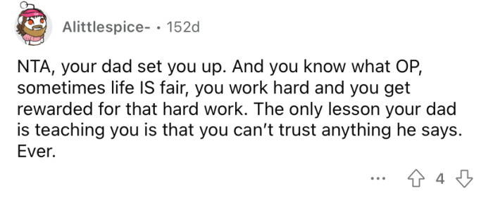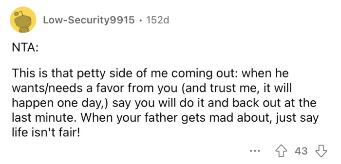 His dad's response was, "Life isn't fair." Understandably, the OP has been distant from his father ever since.