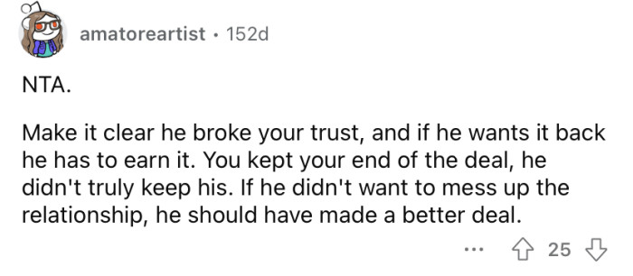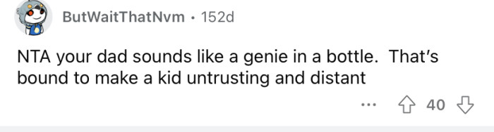In this scenario, the Redditor's reluctance to forgive his father highlights the long-lasting impact of trust violations on familial relationships.