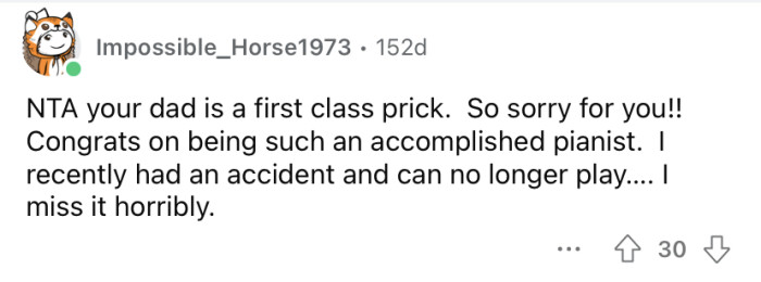 Reddit/Piano_throwaway_When he was 15, he wanted to quit his lessons. But his dad made a deal with him that if he kept them up and did well, he would buy him a car.