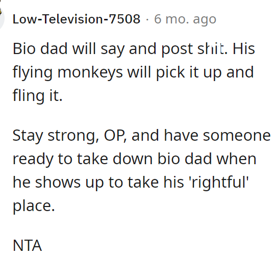 "Stay strong, OP, and have someone ready to take down bio dad."