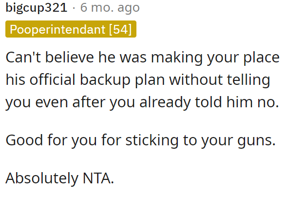 My dad was being evicted after letting his daughter, her kids, and her friend live with him rent-free for a year. I told him that if he was to be evicted, he could not come and live with me."Good for you for sticking to your guns."