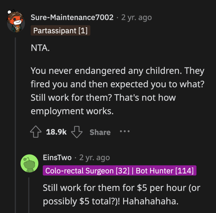 "We're so mad that you endangered our children. You're fired! But you must continue coming to work for $5!"