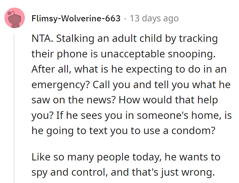 RedditOP isn't surprised by his dad's news and true crime habits. However, as an adult, he feels he doesn't need his phone tracked.