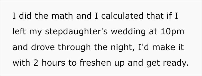 “Now I am regretting not leaving earlier. But my close friend’s wife, who helped plan my stepdaughter’s wedding, told me it’s extremely rude for the father of the bride to leave early. It was a mistake listening to her,” he explained.