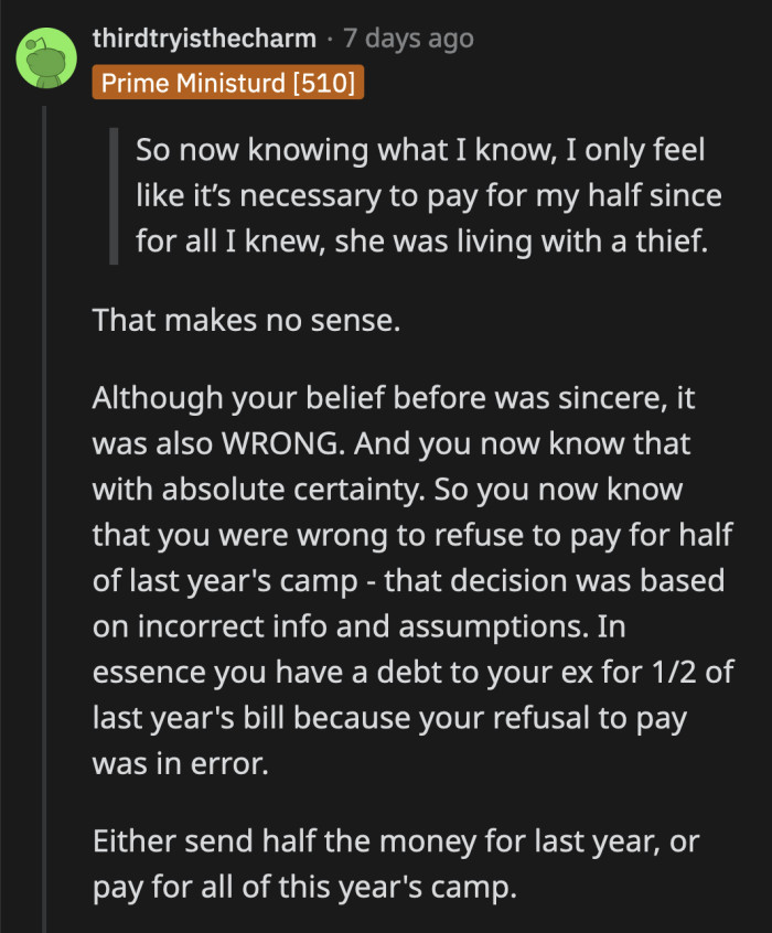 Despite the custody agreement, his daughter stopped talking to him and refused to see OP. In 2022, OP's ex-wife asked him to pay his half for their daughter's summer camp, but he refused.