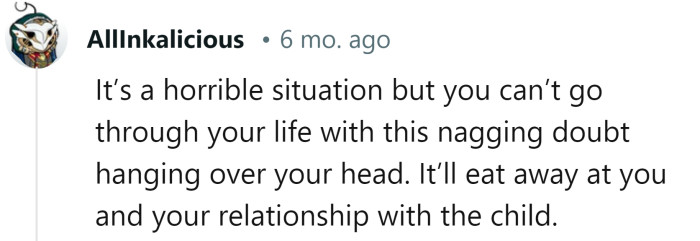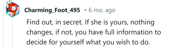 Despite this, the OP is unsure if he wants to know the truth or not. He loves his little girl and doesn't want anything to change between them.