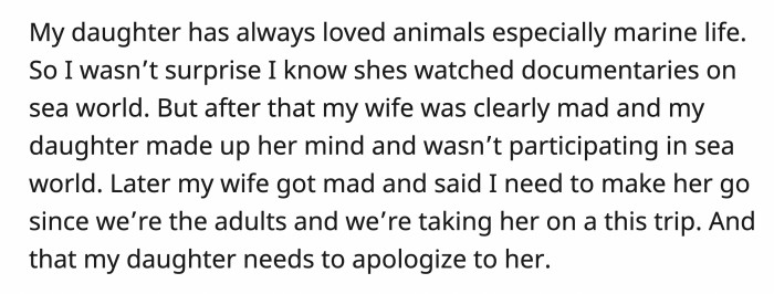 OP Did Right by Telling His Wife Off About Forcing His Daughter to Go to Sea World and Wanting an Apology