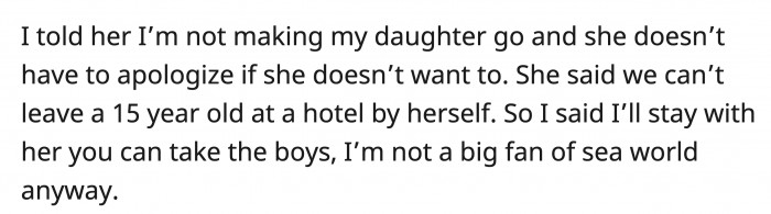 OP says that he won't be forcing his daughter to go to Sea World, and he also won't make her apologize to him. His wife argued again that they simply can't leave a teenager alone at the hotel.