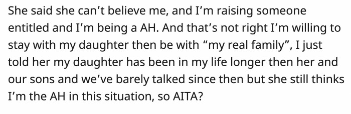 She said OP is raising an entitled brat and that it's not okay that he's more willing to spend time with his daughter than with his 'real' family. OP said his daughter has been a part of his life far longer than his wife and their sons.