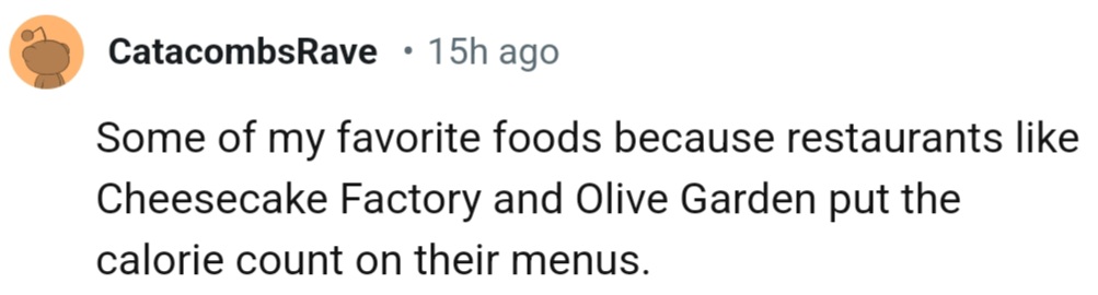 "Restaurants like Cheesecake Factory and Olive Garden put the calorie count on their menus."