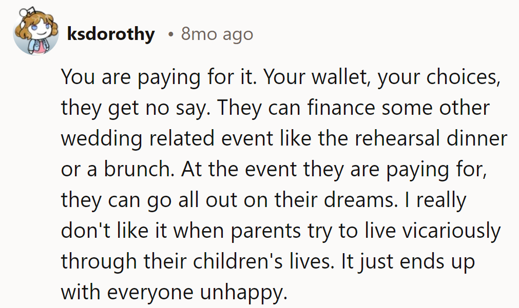 Exactly! Their wedding, their rules. Moms, hands off the dress-up dolls!