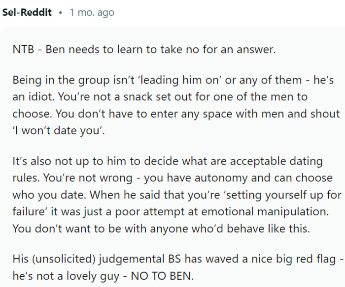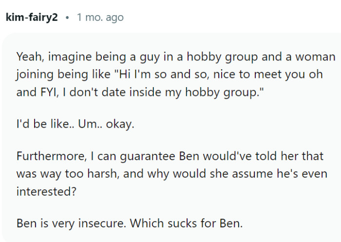 Ben also accused OP of leading him on by not being upfront about her stance on dating within the group. OP felt this was unjustified as she did not perceive her behavior as such and found it odd to bring up her dating preferences without any relevant context.