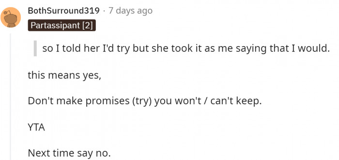 "I'll try" doesn't mean yes, but it also doesn't mean no, so she should have just said no.