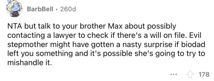 RedditShe explained that she has lived with her older brother since her mother died when she was six, and their dad was too busy with his new family to take her in.