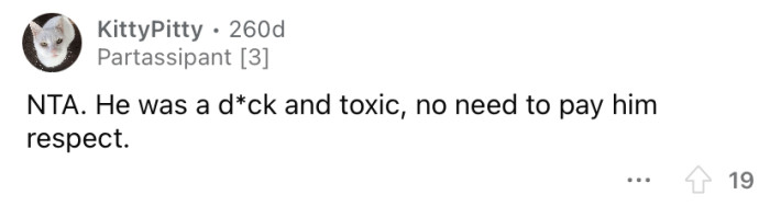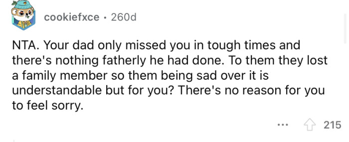 But the OP asserts that the truth is her dad was a "pathetic excuse for a father." She claims he has been dead to her for a long time.
