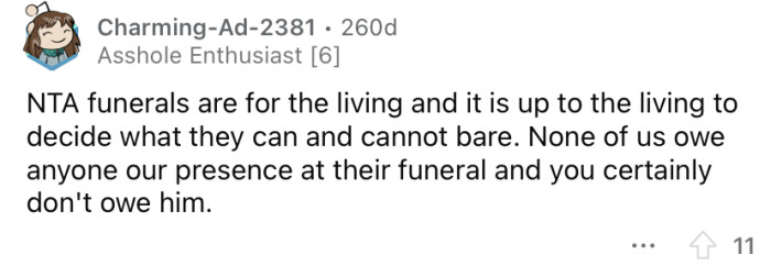 Recently, the OP received a call from her dad's wife saying he had passed away, and she was required to attend his funeral. However, the OP refused to go.