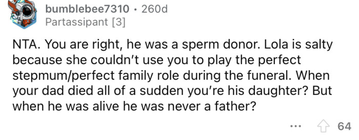 She states that she doesn't have any love for her father, and to her, he's just a sperm donor. Now, the OP has been called a "pathetic excuse for a daughter" by her dad's wife.
