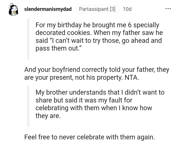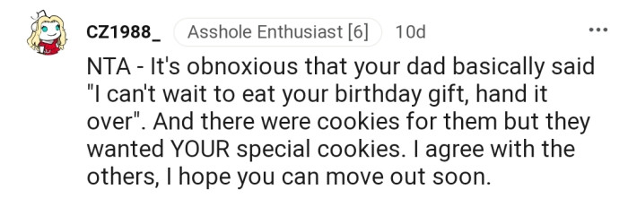 "NTA - It's Obnoxious That Your Dad Basically Said 'I Can't Wait to Eat Your Birthday Gift, Hand It Over'..."