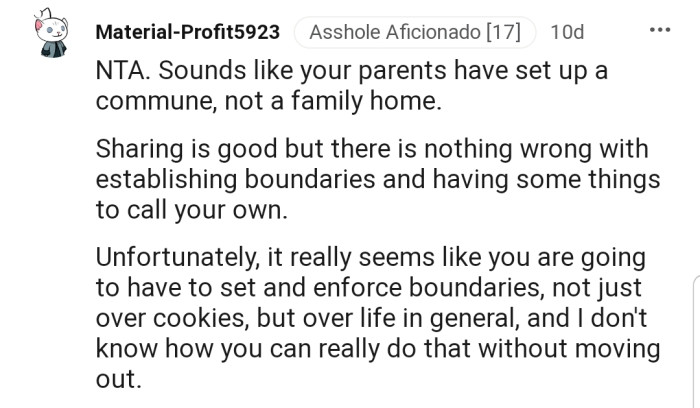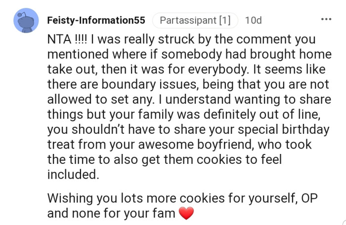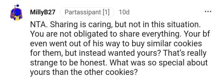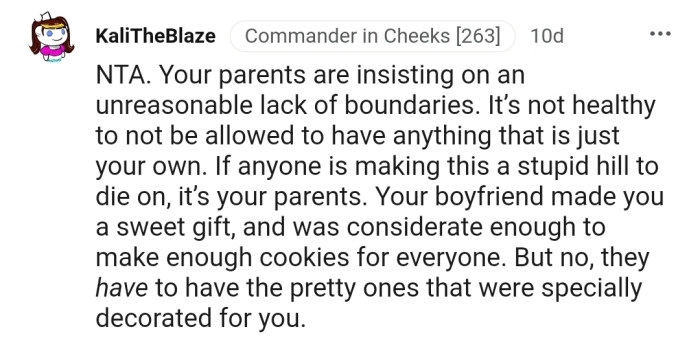 OP stood her ground and refused to share, leading her parents to demand that she take the cookies out of the house, which she did. Although her boyfriend and his parents didn’t feel OP was wrong, her siblings thought she had some faults.