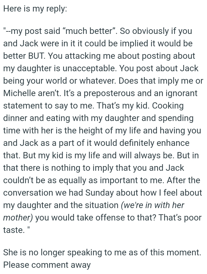I replied with the text that I posted in the post, and it might make me the a-hole for getting angry at my girlfriend for taking issue with my Facebook post.The Reddit post got hundreds of comments and here are a bunch of the most upvoted ones