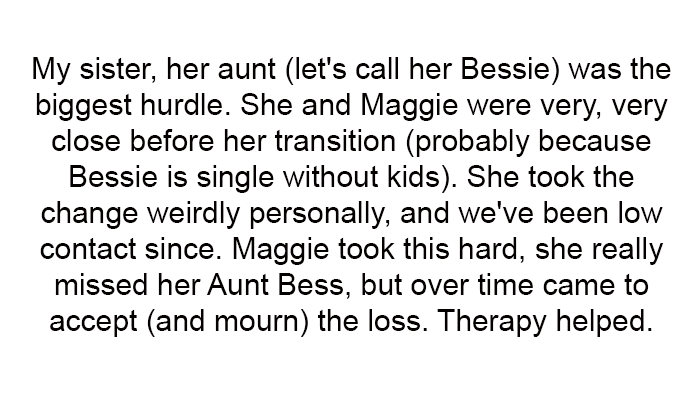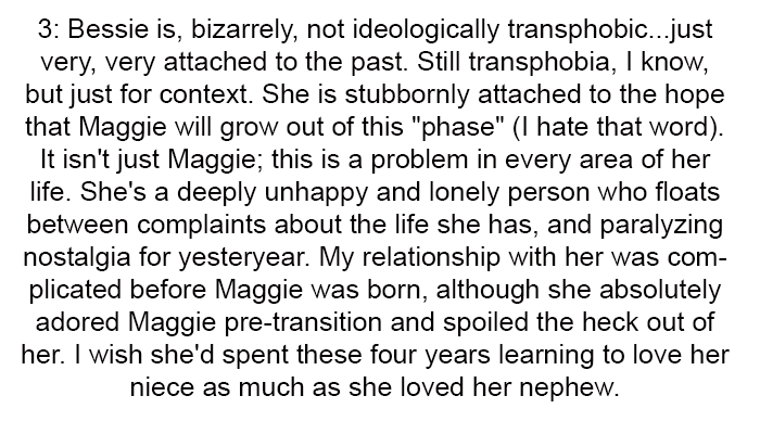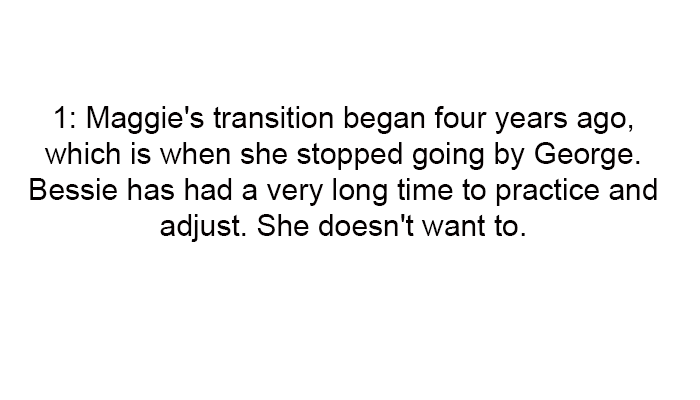 Despite the family's overall support, Bessie’s refusal to use Maggie’s chosen name created friction. The birthday dinner, intended to be a family celebration, turned awkward when Bessie called Maggie by her birth name.
