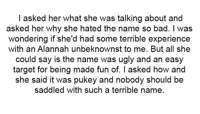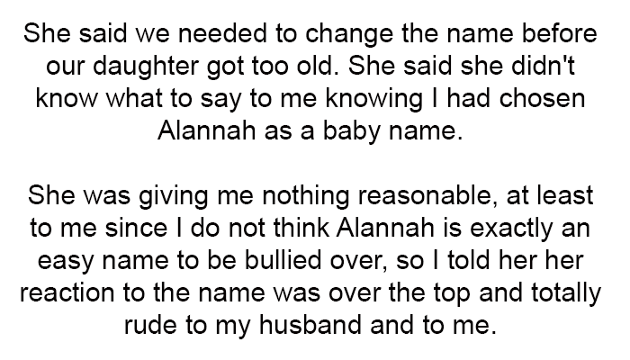 She has never been like this before. She had no complaints about our son's name, and she was never rude like that. But she had such a big reaction to Alannah.