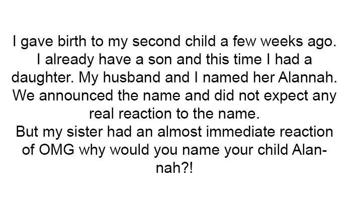A new mother recently named her daughter Alannah, a name she and her husband found beautiful. Unexpectedly, her sister reacted strongly, calling the name ugly and unsuitable, and suggesting it would make the child an easy target for bullying.