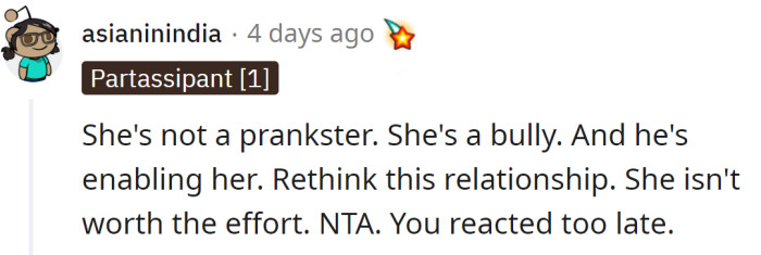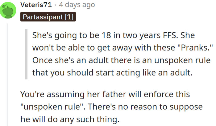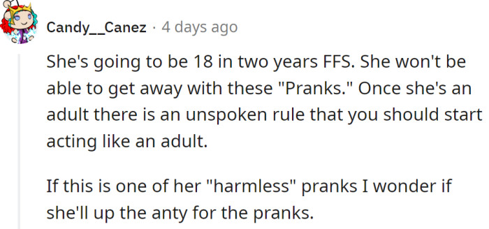Her stepdaughter is a very stubborn person, and that makes it complicated for the OP to maintain a good relationship with her. Nonetheless, she is a teenage girl who likes pranks.