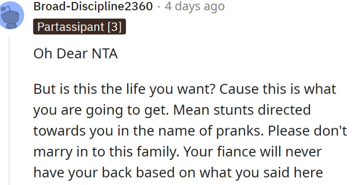 A Redditor said they would call off the engagement if they were her.A Redditor said they would call off the engagement if they were her