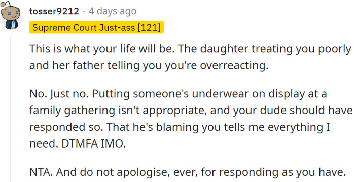 "Putting someone's underwear on display at a family gathering isn't appropriate"