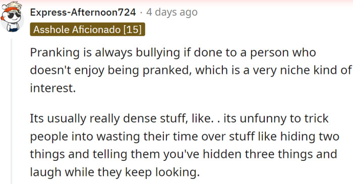 "Pranking is always bullying if done to a person who doesn't enjoy being pranked"