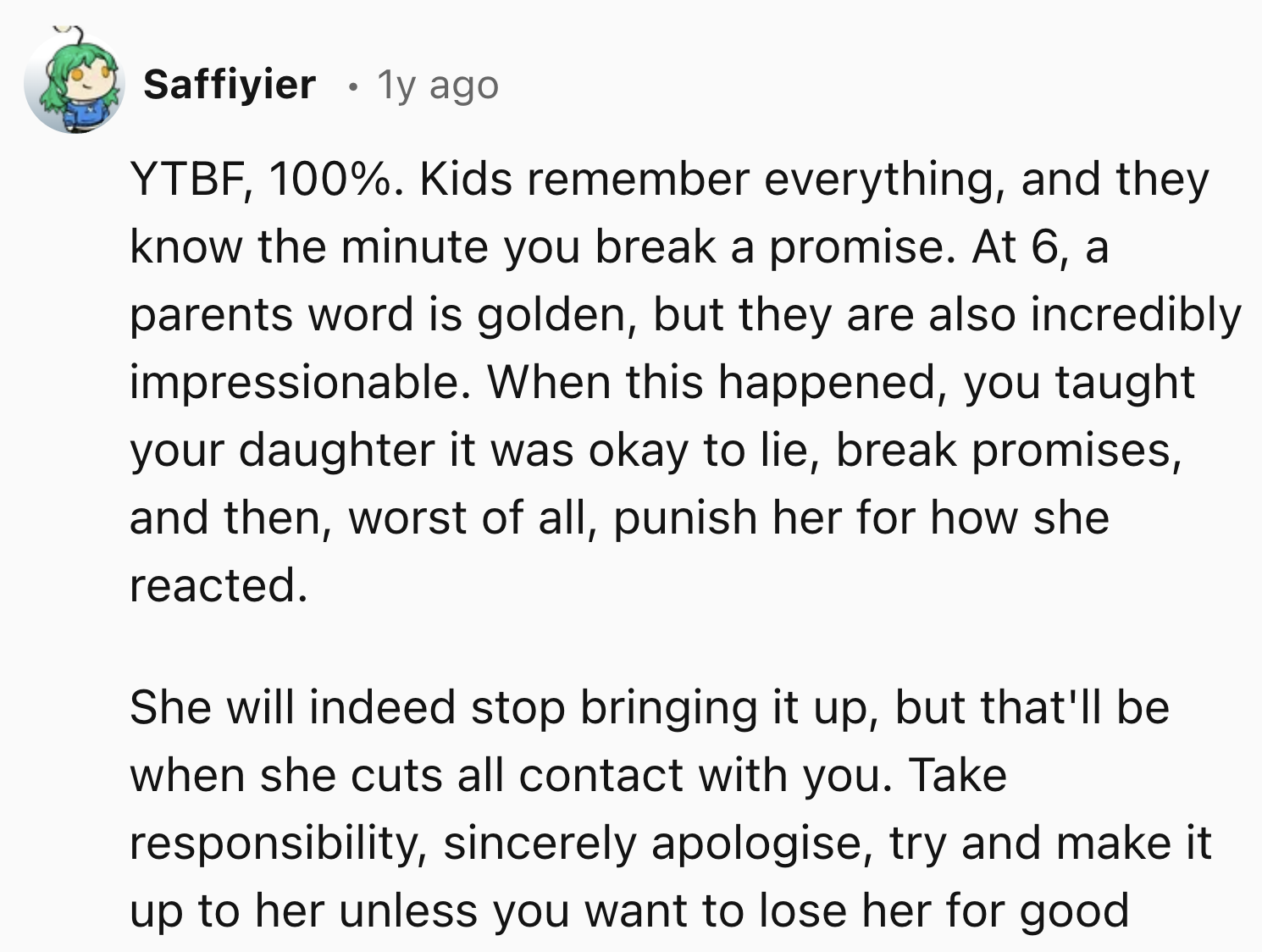 Years later, OP’s daughter, now 14, frequently brings up the incident whenever she’s in trouble or breaks a promise. She accuses OP of always lying and recalls being sent to bed "about three hours early" (though OP clarifies it was barely an hour early).