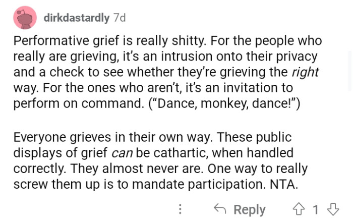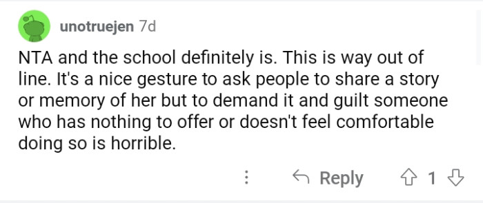 However, is it just to force a peer with no intimate connection or relation with the passed person, as stated in this Reddit post just because the school said so? You can scroll down to red more about this post.