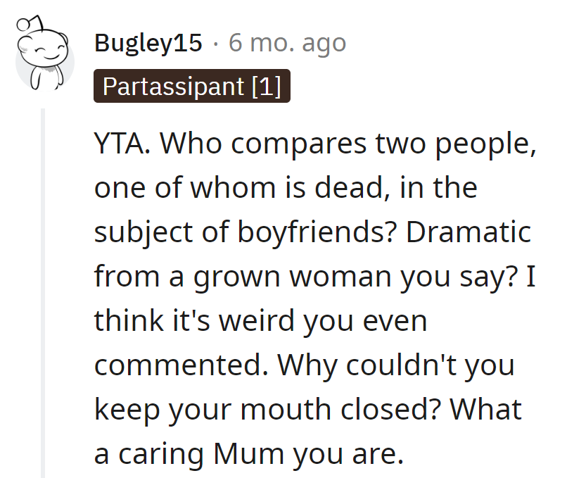 OP expressed her preference for her daughter's current boyfriend over her late ex-boyfriend. This comparison, while perhaps intended as a compliment to the current partner, disregarded the complex emotions involved in grieving and moving on from a past relationship.