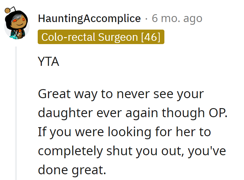Seems she earned the YTA badge and the wish for radio silence. Wonder if empathy is on backorder in other areas of her life.
