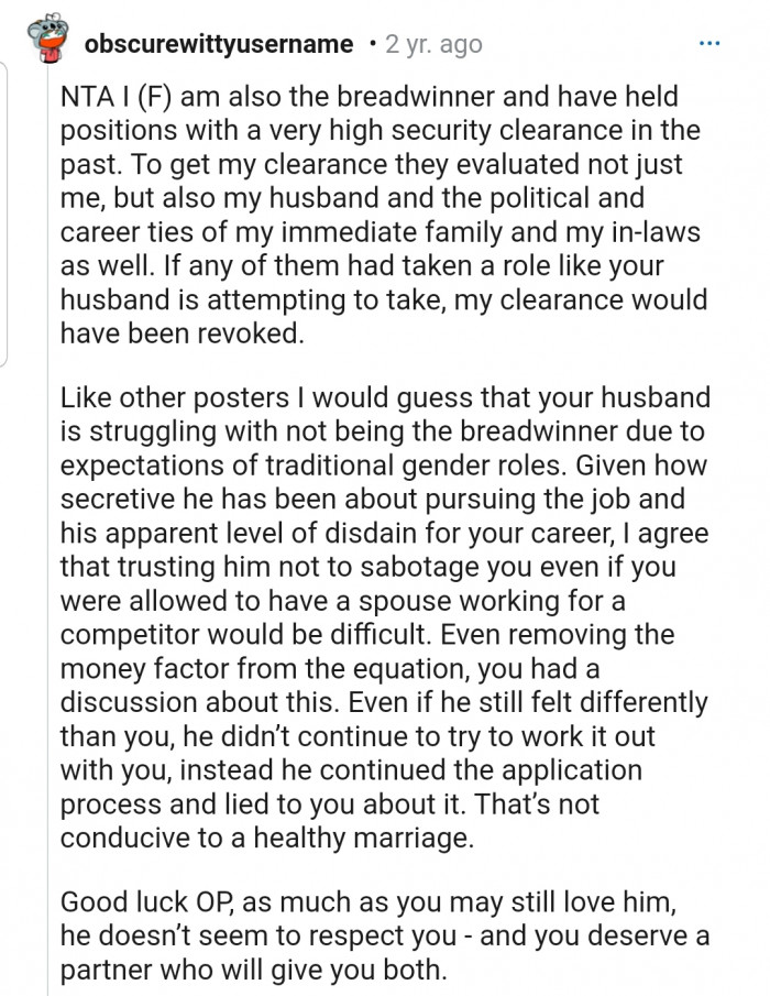A Redditor shared that her husband had gotten a job offer from a company in direct competition with the company she works at.