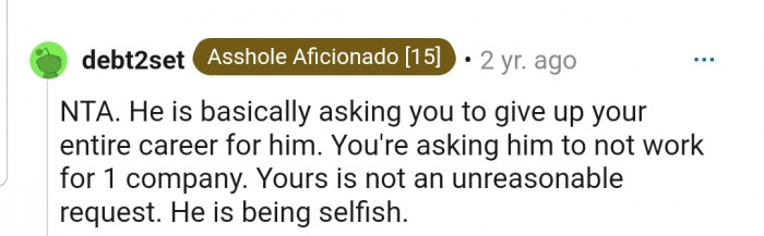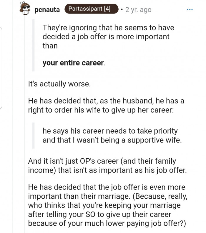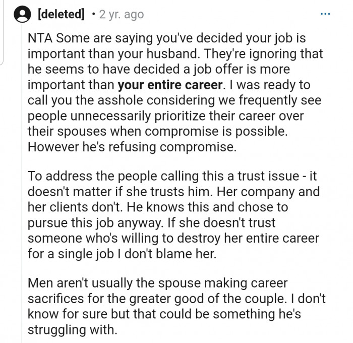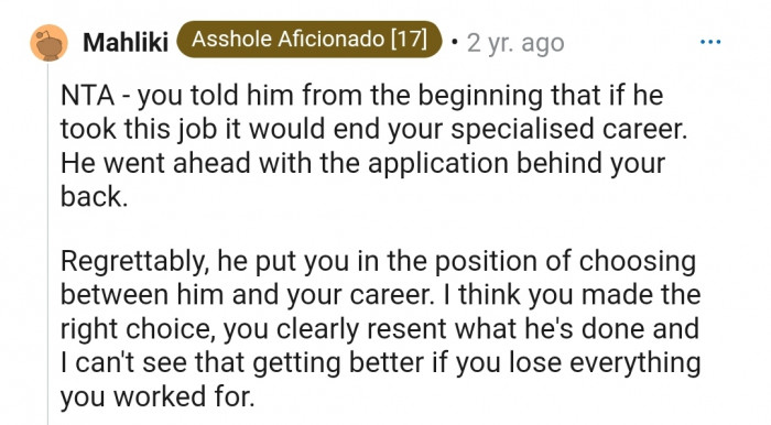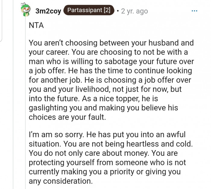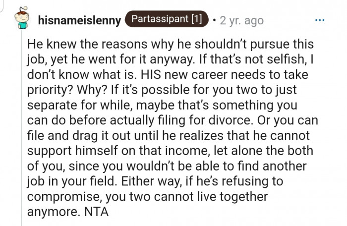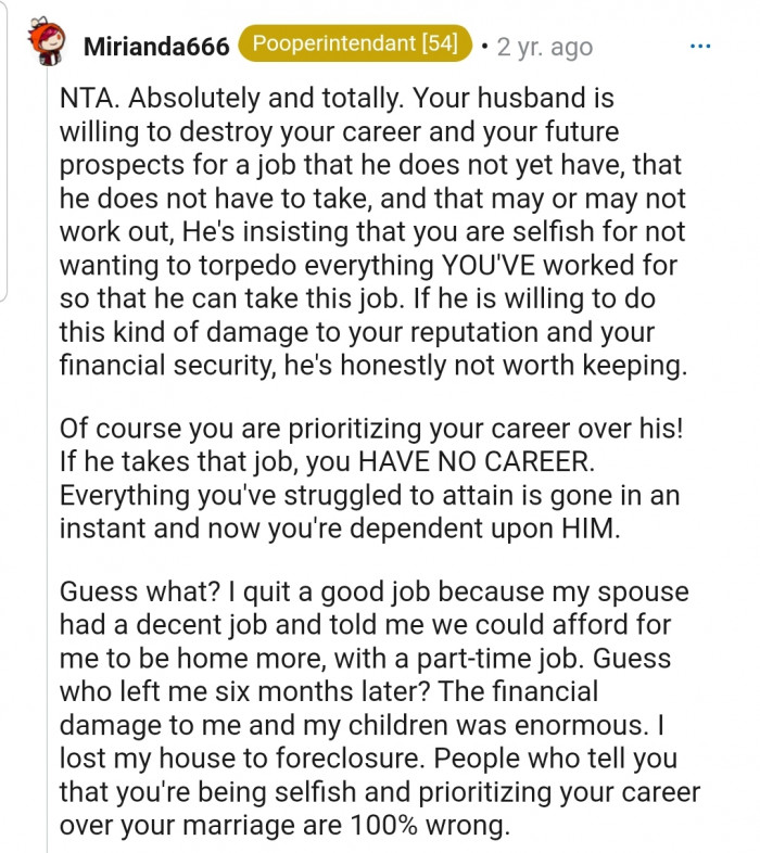 The people in the comments section agree that OP isn’t in the wrong in this situation. According to them, OP’s husband is being selfish because OP’s career is specialized, and she wouldn’t be able to work in her field ever again if he took the job.