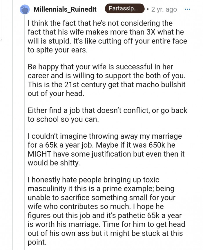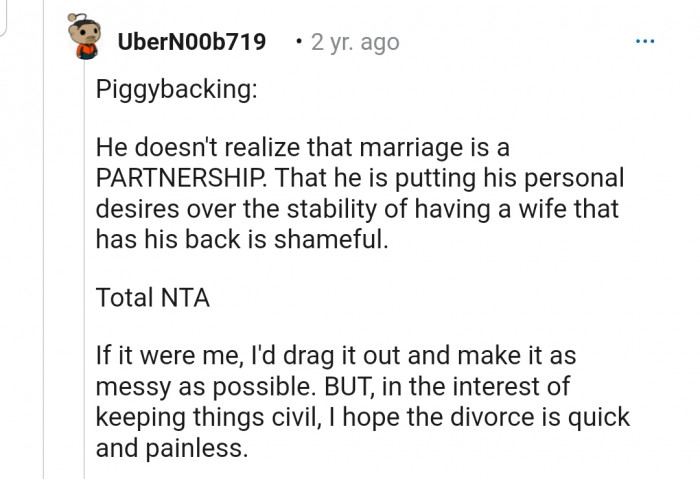 "He doesn't realize that marriage is a PARTNERSHIP. That he is putting his personal desires over the stability of having a wife who has his back is shameful."
