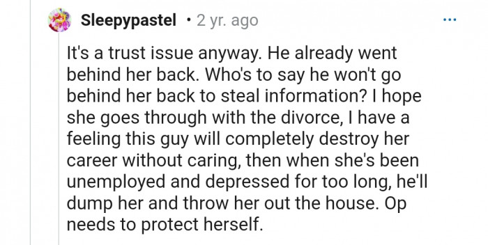 "He already went behind her back. Who's to say he won't go behind her back to steal information?"