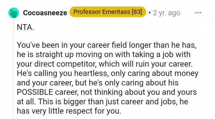 "He is choosing a job offer over you and your livelihood, not just for now, but into the future."