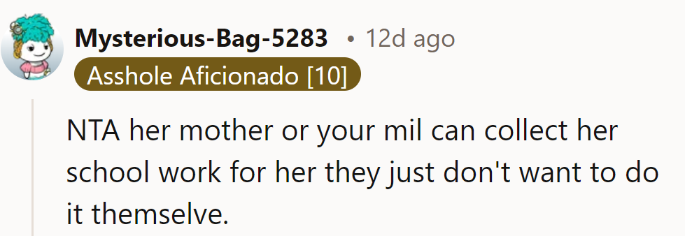 "NTA. Schoolwork pick-up: delegation time for mom or MIL. Looks like the errand dodge is strong with them."